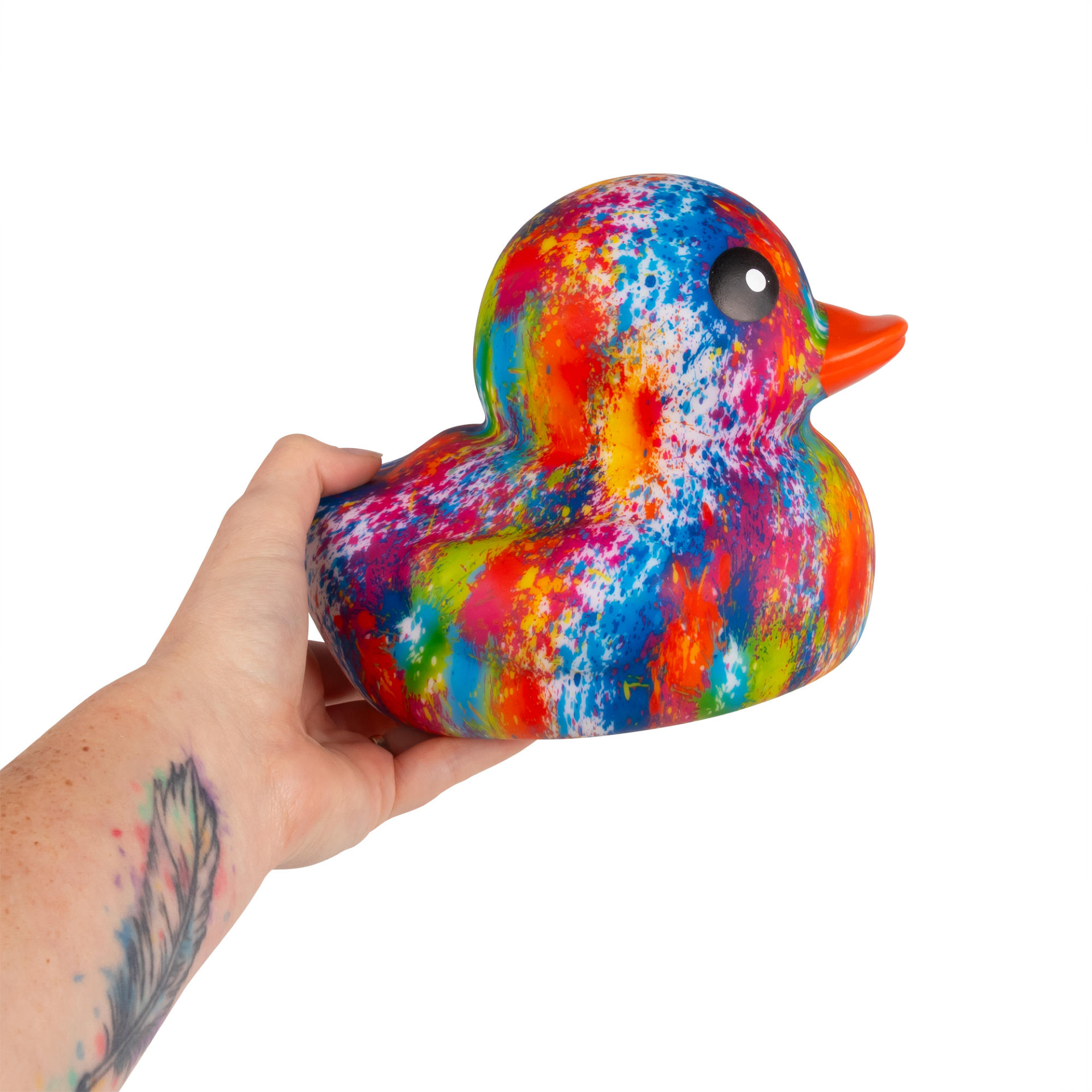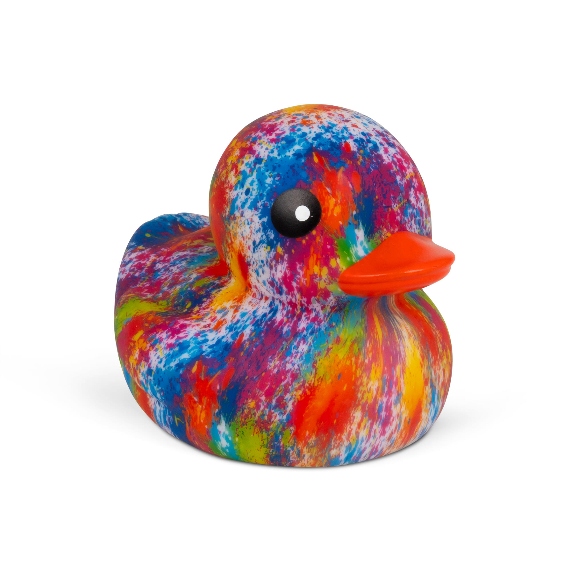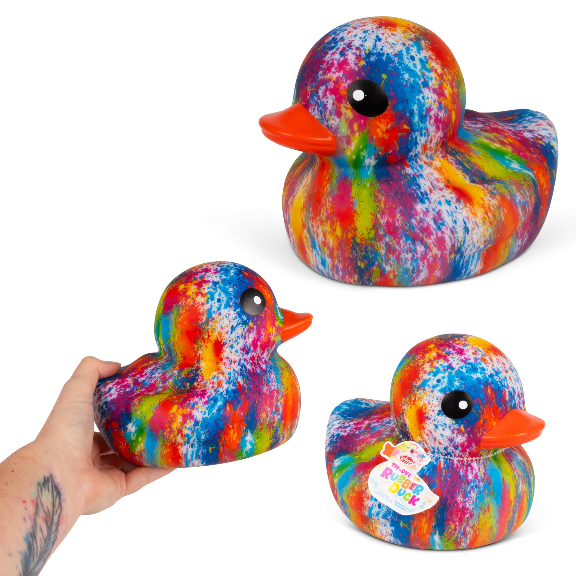 Deze nieuwe, kleurrijke Tie Dye Rubber Badeend is 18 cm in diameter en vormt een vrolijke blikvanger! Deze superleuke regenboogkleurige badeend drijft op het water en is erg leuk als accessoire in een bad, waterteil, bubbelbad of zelfs een vijver of zwembad. Daarnaast is deze vrolijk gekleurde regenboogeend bij uitstek geschikt als vrolijke accessoire voor een poolparty of ander (zwembad)feest. Deze grote badeend heeft met zijn kleurrijke uiterlijk nu al een soort cultstatus verworven in verschillende communities.