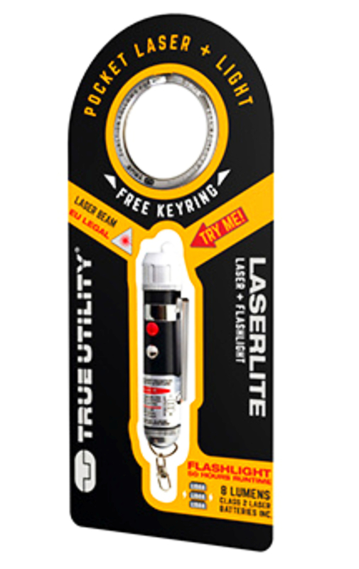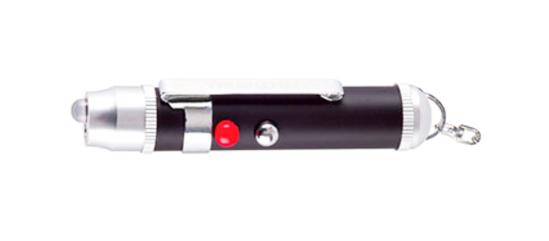 * Een krachtig LEDlampje en rood laserlampje (klasse II) in sleutelbosformaat.